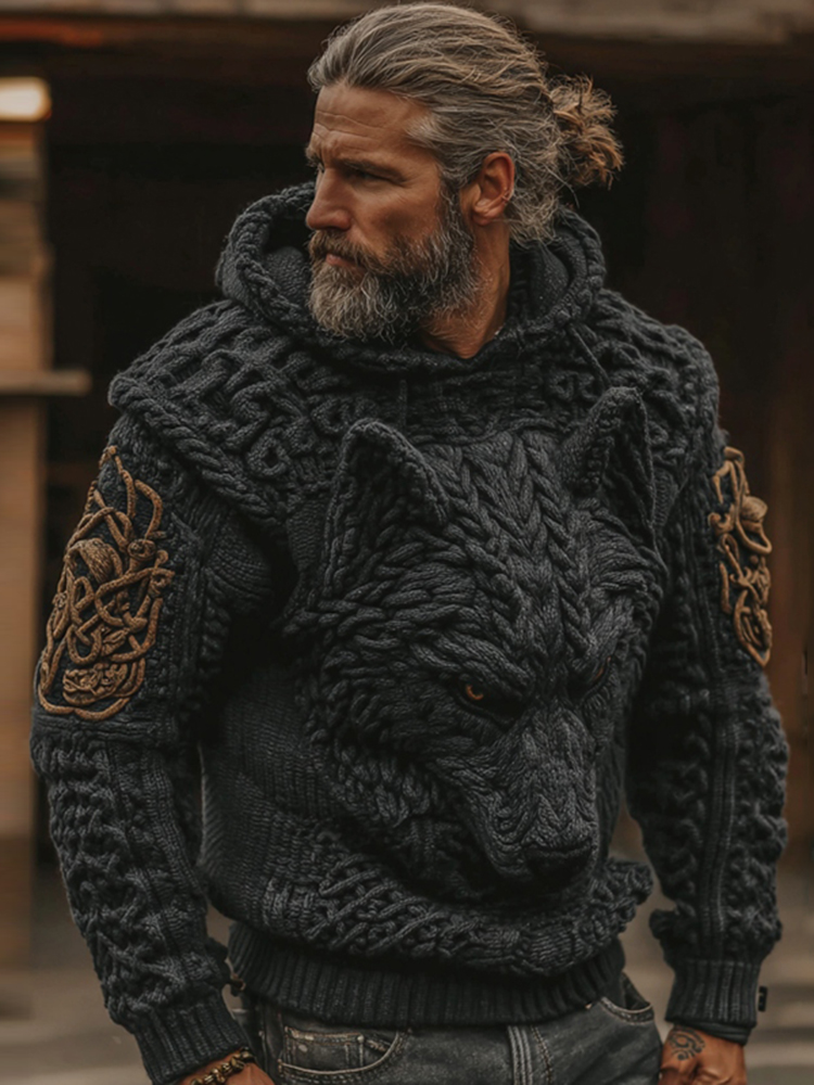 Men's Viking Celtic Wolf Pattern Art Cozy Casual Hooded Sweater