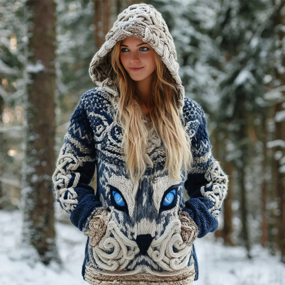 Viking Blue Wolf Eye Art Women's Knit Hooded Sweater