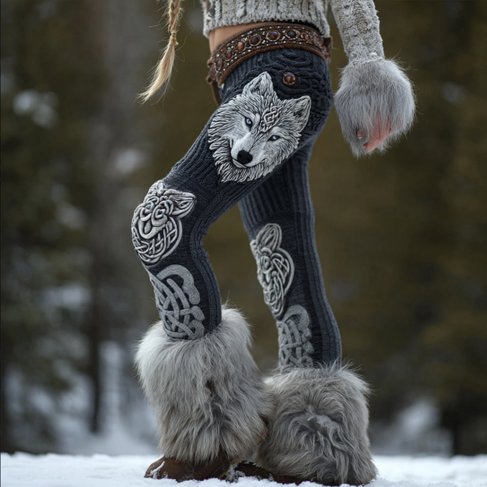 Women's Viking Style Wolf Head Embroidered Celtic Knot Casual Leggings